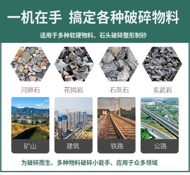 礦石破碎、建筑骨料生產(chǎn)、水利水電、鐵路、道路建、化工等,維修方便、便于現(xiàn)場維護(hù)