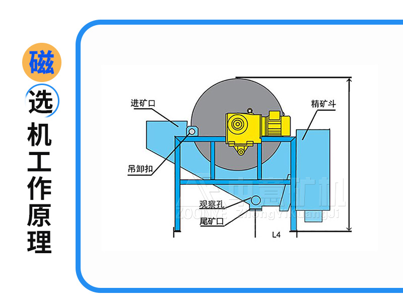 礦漿經給礦箱流入槽體后,在給礦噴水管的水流作用下,礦粒呈松散狀態進入槽體的給礦區。在磁場的作用,磁性礦粒發生磁聚而形成“磁團”或“磁鏈”,“磁團”或“磁鏈”在礦漿中受磁力作用,向磁極運動,而被吸附在圓筒上。由于磁極的極性沿圓筒旋轉方向是交替排列的,并且在工作時固定不動,“磁團”或“磁鏈”在隨圓筒旋轉時,由于磁極交替而產生磁攪拌現象,被夾雜在“磁團”或“磁鏈”中的脈石等非磁性礦物在翻動中脫落下來,被吸在圓筒表面的“磁團”或“磁蓮”即是精礦。精礦隨圓筒轉到磁系邊緣磁力較弱處,在卸礦水管噴出的沖洗水流作用下被卸到精礦槽中,如果是全磁磁輥,卸礦是用刷輥進行的。非磁性或弱磁性礦物被留在礦漿中隨礦漿排出槽外,即是尾礦。