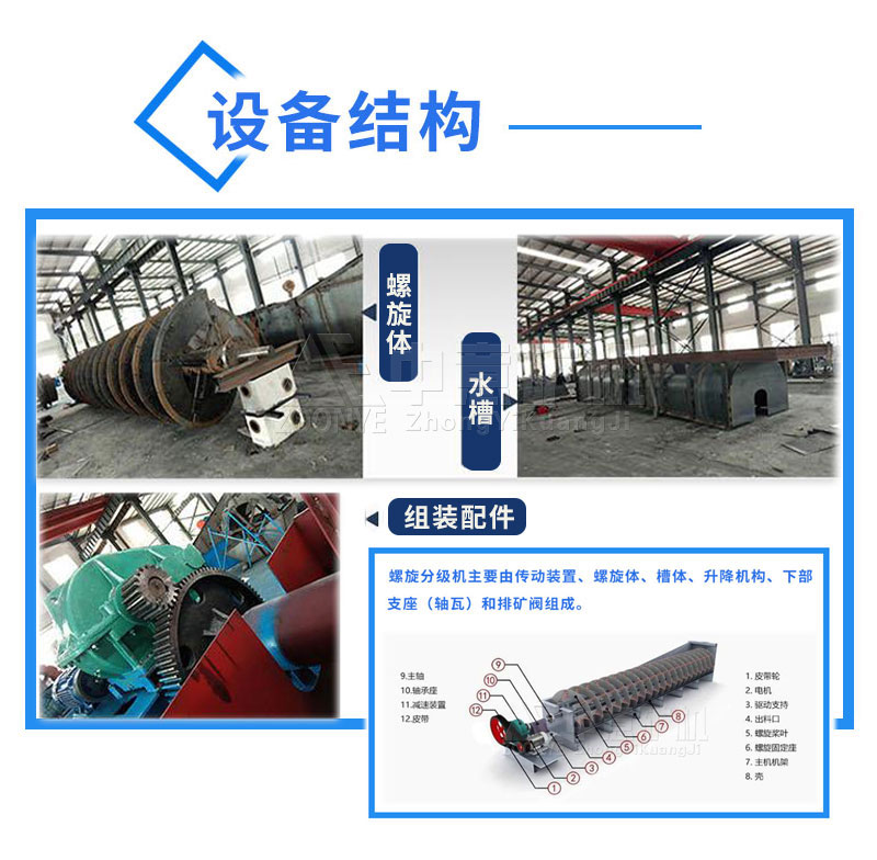 螺旋分級機主要由傳動裝置、螺旋體、槽體、升降機構、下部支座(軸瓦)和排礦閥組成。