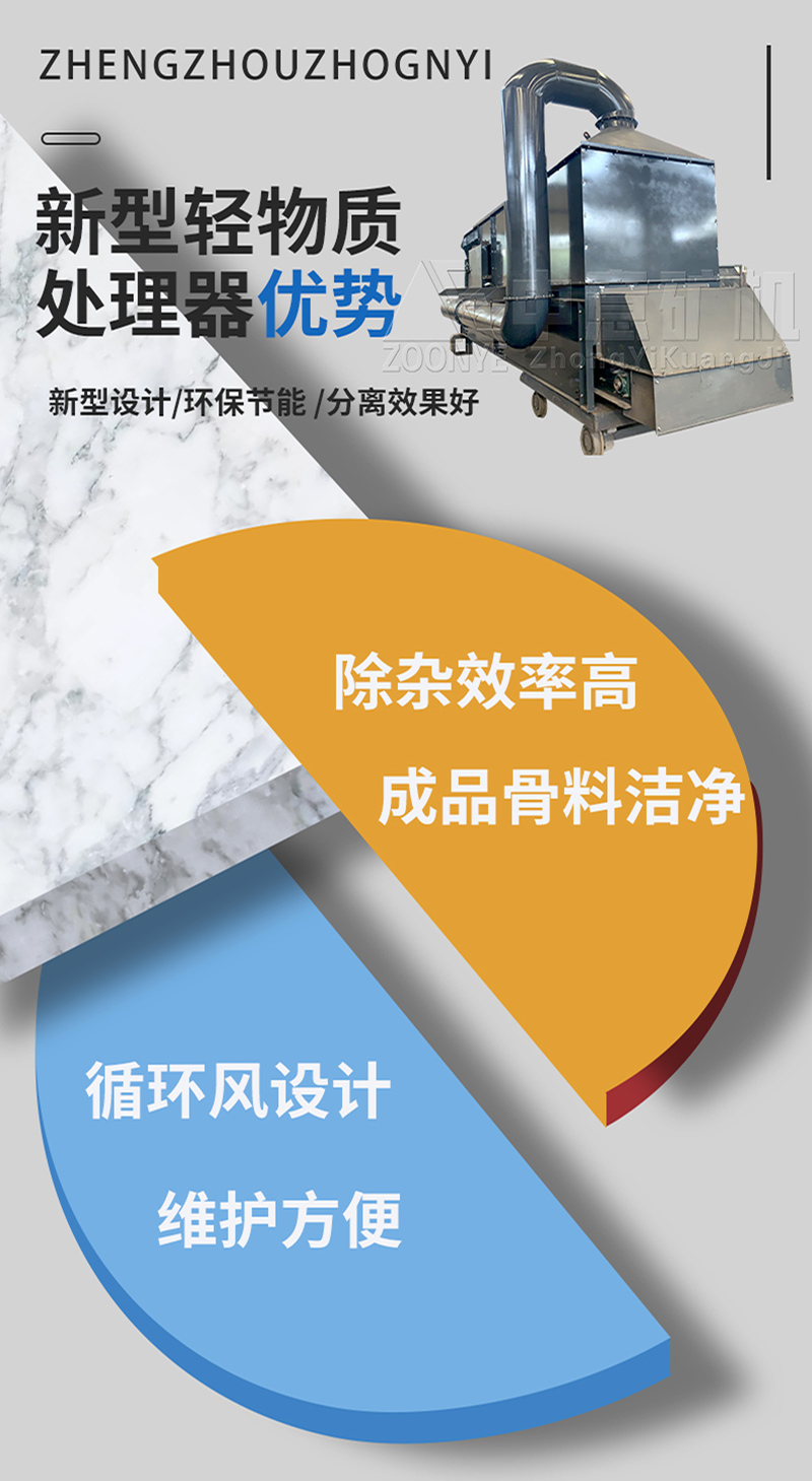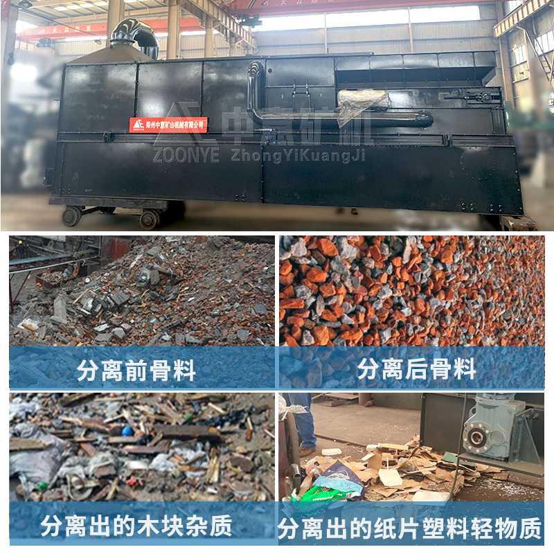 雖然全國各地都在掀起建筑垃圾再生利用的浪潮,國內能夠生產輕物質分離器的廠家卻少之又少,而且分離效果并不明顯。為了改變這種現狀,鄭州中意研發生產了輕物質分離器,用于對建筑垃圾中的橡膠、布塊、塑料、木屑、紙屑、泡沫等輕物質進行分離,輕物質分離率較高。相比以往的人工分揀及水選,工作效率高,分離精度好,環保性好,不污染環境。整個生產處理過程為干式分離,不會產生新的二次污染,大大提高了工作環境的舒適度。