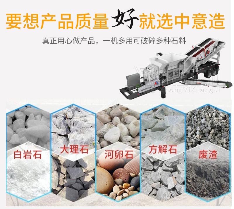 鄭州中意的移動式石子破碎機質量好、規格全、價格優,廠家會根據您的實際生產情況,為您搭配合適的生產線,且支持定做。若您想選購一臺這樣的設備,不妨考慮和鄭州中意廠家合作,您可以來廠參觀考察、免費試機!